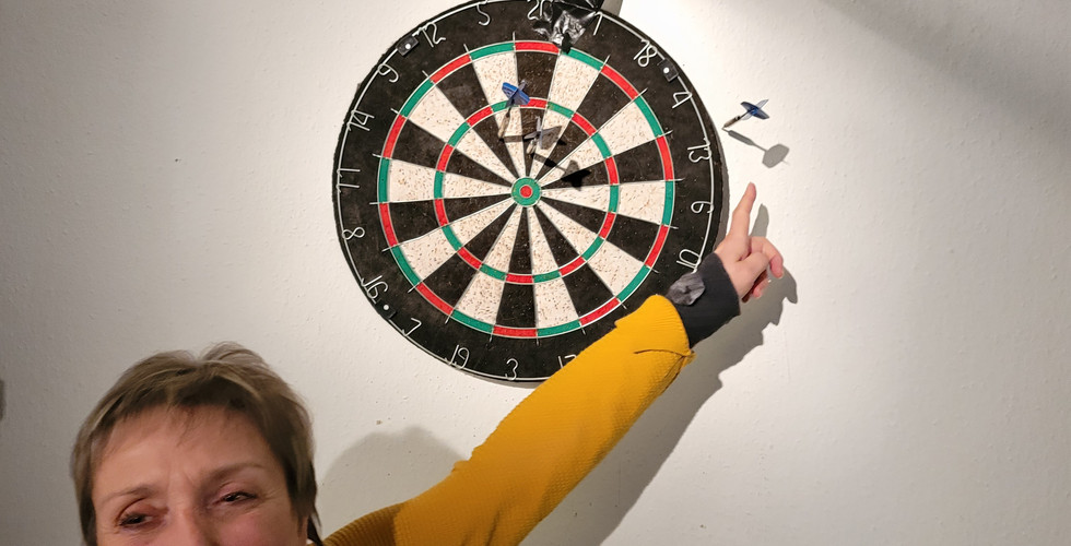 Auf insgesamt 4 Scheiben wurde mit ausgefeilter technischen Unterstützung gleichzeitig geworfen und gefiebert. Neben hochklassigen Matches war dabei auch der eine oder andere kuriose Wurf zu sehen. In Erinnerung bleiben dabei sicher der "Ickelsheimerische" Gedächtniswurf NEBEN die Scheibe und IN die Wand von Gabi Ickelsheimer sowie der seltene "Robin Hood" unseres Gastes Axel. Beide sind auch nochmal in der Galerie festgehalten.