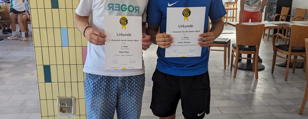 Aber der Reihe nach. Wie Ihr wisst, war Heinrich Jacob ja ein großer Kinderfreund. Und auch er wurde von vielen Kindern und Jugendlichen gemocht. Also kam die Idee auf, doch in seinem Sinne ein Kinder-und Jugendturnier auf unserer Anlage auszutragen. Und weil ein solches Turnier auf unserer Anlage das letzte Mal vor 18 Jahren stattfand, war es auch in unserem Sinne. Angesprochen werden sollten Kinder und Jugendliche, für die der Wettkampf nicht alltäglich ist, die nicht -oder selten -von einem Turnier zum anderen fahren. Das Turnier war also als „breitensportliches“ gedacht und wurde als solches angenommen. Wie erwähnt spielten 28 Kinder und Jugendliche (Altersklassen und Ergebnisse unter www.stv-tennis.de -Turniere) Einzel- Hauptrunde-und Nebenrunde sowie Doppel. Angereist waren sie aus Dresden, Halle, Naunhof, Machern, Markranstädt, Espenhain oder aus Leipziger Vereinen wie dem LSC oder dem TSV 1893 Wahren. Aus unserem Verein kämpften Paulina Nolopp, Tara Hartmann, Johanna Tabea Löbe, Robert Hartmann, Kevin Kessler, Matti Dau und Lennard Backhaus bei hochsommerlichen Temperaturen um jeden Punkt. Für Viele war es die erste Turnierteilnahme. Und da eine solche Premiere oft von Lampenfieber begleitet wird, wollten wir es den Spielerinnen und Spielern so angenehm als möglich beim TC RC Sport machen. Sie sollten sich willkommen fühlen und spüren, dass sie die wichtigsten Personen an diesem Wochenende sind. Bei der gemeinsamen !!!! Begrüßung bekamen sie deshalb einen kleinen Willkommens-Blumenstrauß und einen orange farbenen Überraschungsbeutel. Bananen, Getränke, Kuchen und Mittagessen waren für sie umsonst. Bereits am ersten Turniertag hörten wir viele anerkennende Worte - sowohl von den Teilnehmern als auch von den Eltern.“Wir haben uns vom ersten Augenblick an sehr wohlgefühlt in dieser herzlichen Atmosphäre. So etwas erlebt man sehr selten. Wir kommen im nächsten Jahr wieder“, sagte zum Beispiel der Vater von Rafael Schnarr vom Hallescher TC Peißnitz e.V. Und der spätere Sieger der männlichen U18 Konkurrenz,Fabian Weymar, fand das familiäre und entspannte Klima toll und den kleinen Blumenstrauß cool. Cool war dann auch die Siegerehrung am Sonntag. Bereits einen Tag zuvor hatten wir die Preise wie auf einem großen Gabentisch ausgelegt. Und zur Siegerehrung, bei der wiederum fast alle Spielerinnen und Spieler dabei waren, konnten sich dann die Platzierten vom „Gabentisch“ einen Preis aussuchen. Es war ein schönes Turnier. Noch dazu stress-und pannenfrei. Dabei wurden wir großartig unterstützt. Conny Bierstedt half zupackend in der Küche, Kerstin Hirsch war es zu danken, dass immer genug Nudeln gekocht wurden und frische Melone auf den Tischen stand. Zudem entdeckten wir ihre Schiedsrichter-Fähigkeiten. Danke, Kerstin. Danke auch an Melanie Becker für die Kuchenspenden!!! Und auch bei Florian Dorgerloh bedanken wir uns für seinen Einsatz. Für ihre Spenden bedanken wir uns auch bei Frau Bornschein (Ulis Mutter), bei Gunther Reißaus, bei Andre Schlaubke und Gregor Baron, bei der Firma Eskildsen und bei Birgit Hartmann. Sicher ist: 2024 wird es die 2. Heinrich-Jacob-Junior-Open geben. Andreas Peter, Uli Bornschein, Volker Schmidt, Heike Fiedler
